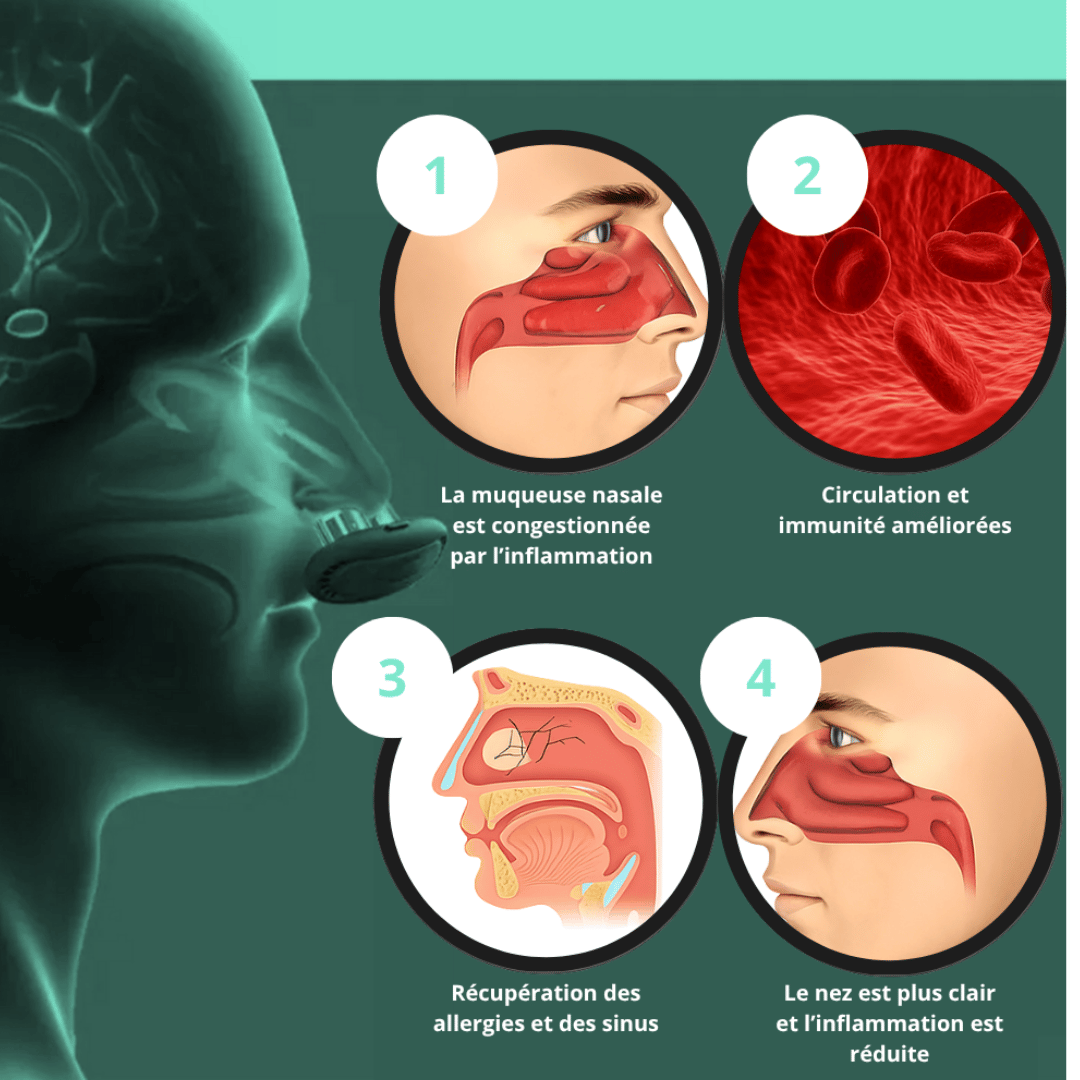 Nos utilisateurs rapportent une amélioration notable de leur respiration et une réduction de la congestion nasale dès les 7 premiers jours d’utilisation régulière (2 fois par jour, 10 minutes). Une solution rapide et naturelle pour retrouver le confort respiratoire.